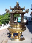 This famous temple was built in 1938 and renovated in 1966 in the Northern Dynasties style with a color focus on gold. We have a nice view of the lake from up here. Papa purchases a lantern shaped charm on our behalf that signifies “family”; we sign it and hang it along a rail just outside the temple. See the photo.