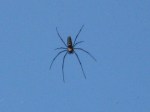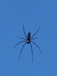 Mama and I are lagging behind when I notice a giant spider hanging on a web directly above us. The spider’s body is the size of my thumb with legs as long as my fingers. The coloring is neon orange and black. Disgusting!
