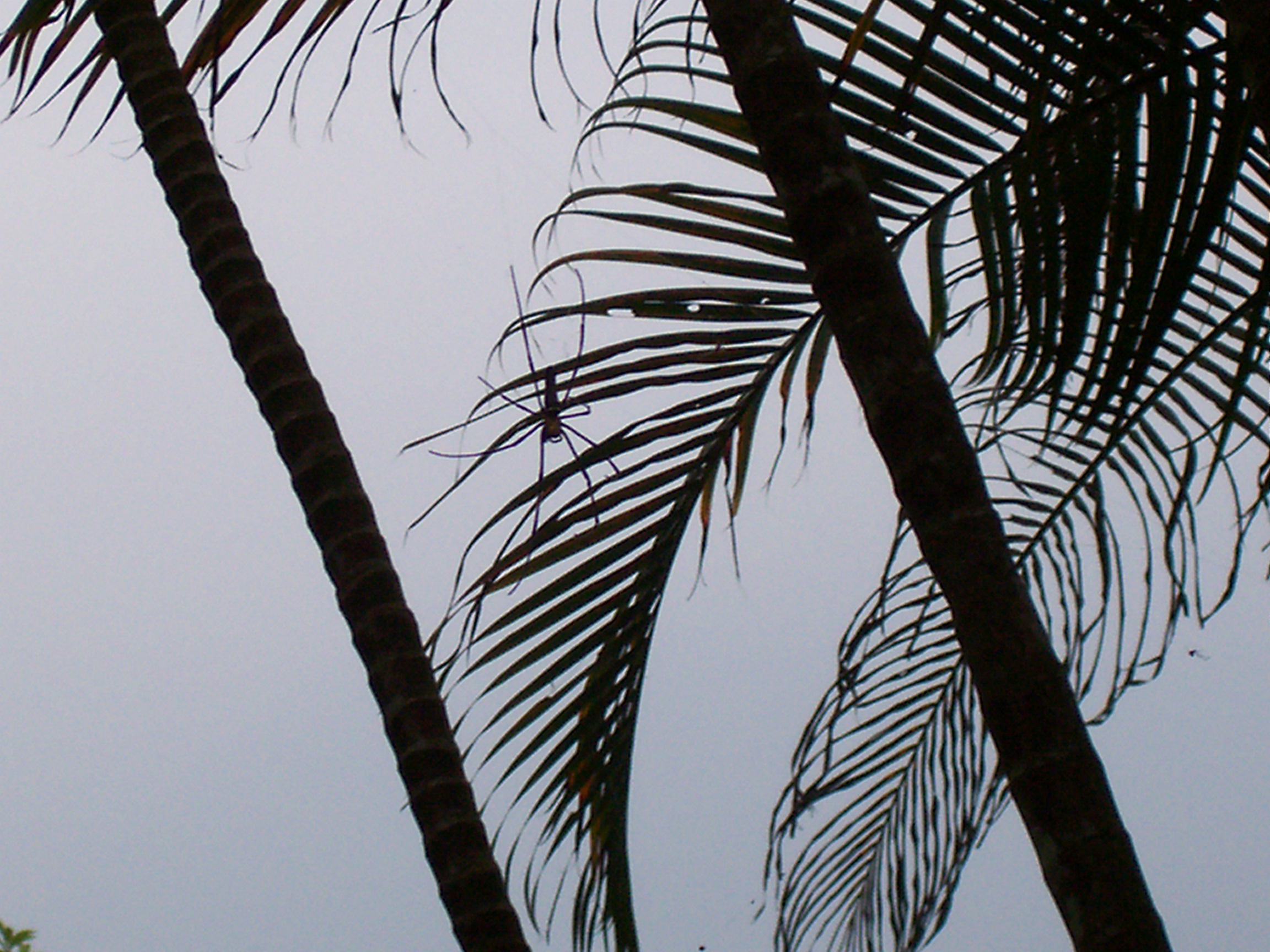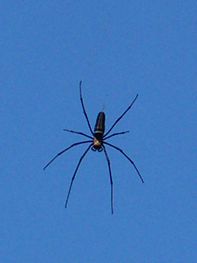 Mama and I are lagging behind when I notice a giant spider hanging on a web directly above us. The spider’s body is the size of my thumb with legs as long as my fingers. The coloring is neon orange and black. Disgusting!