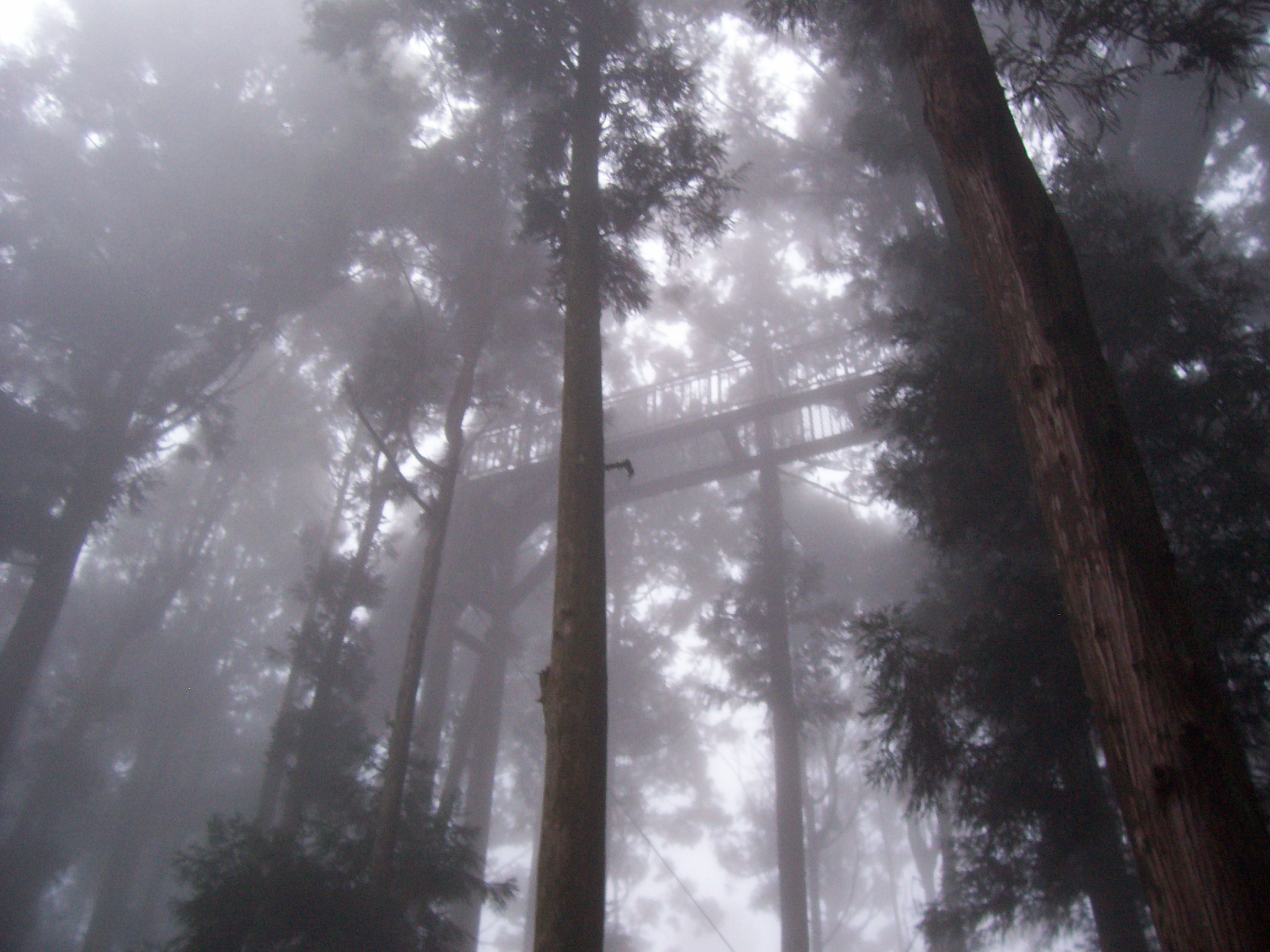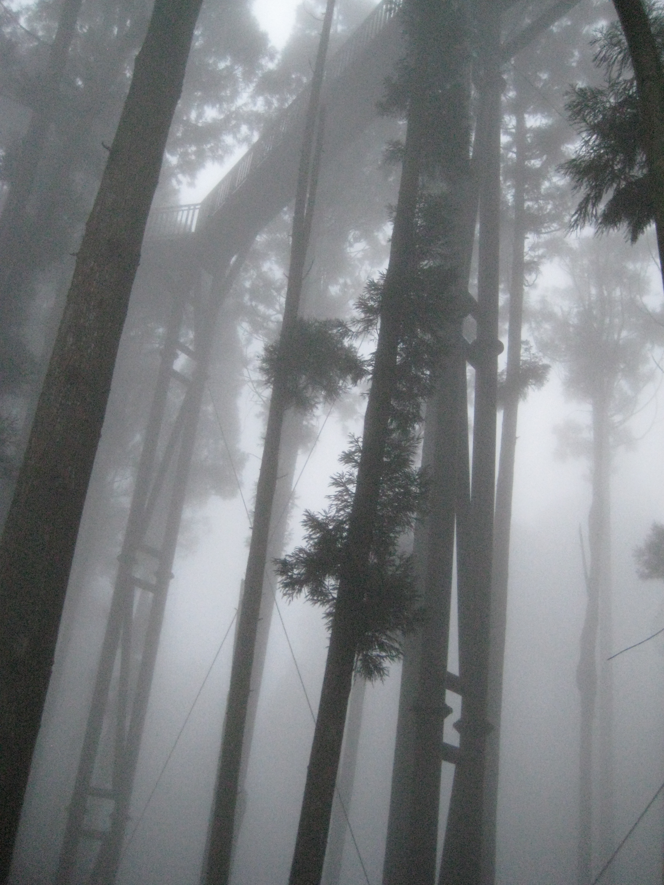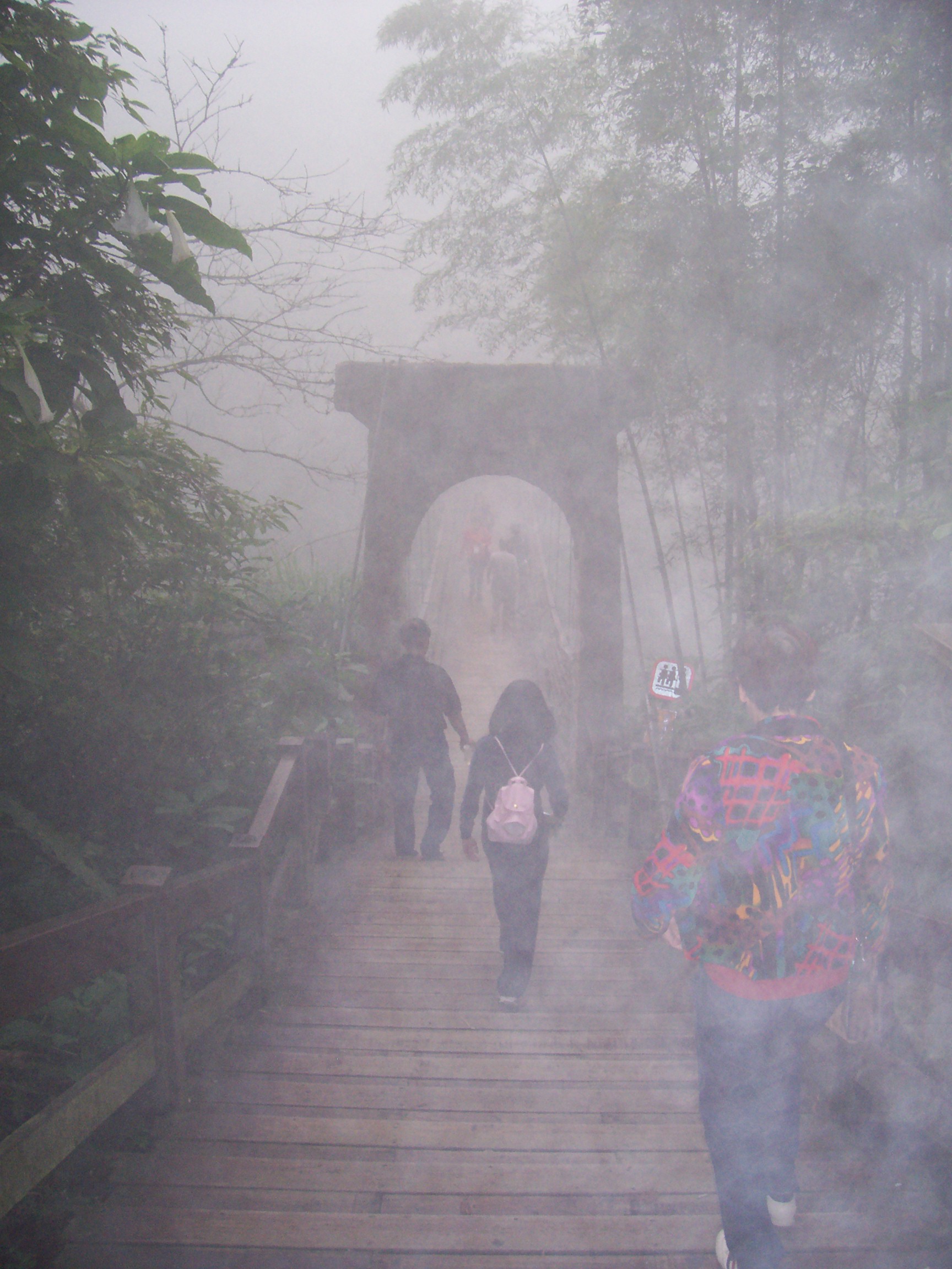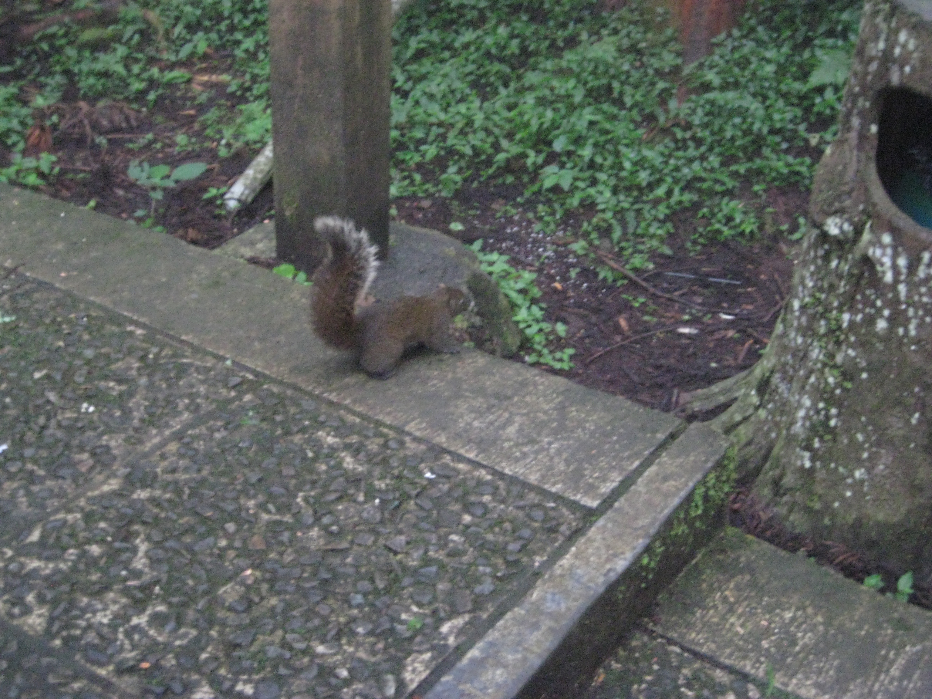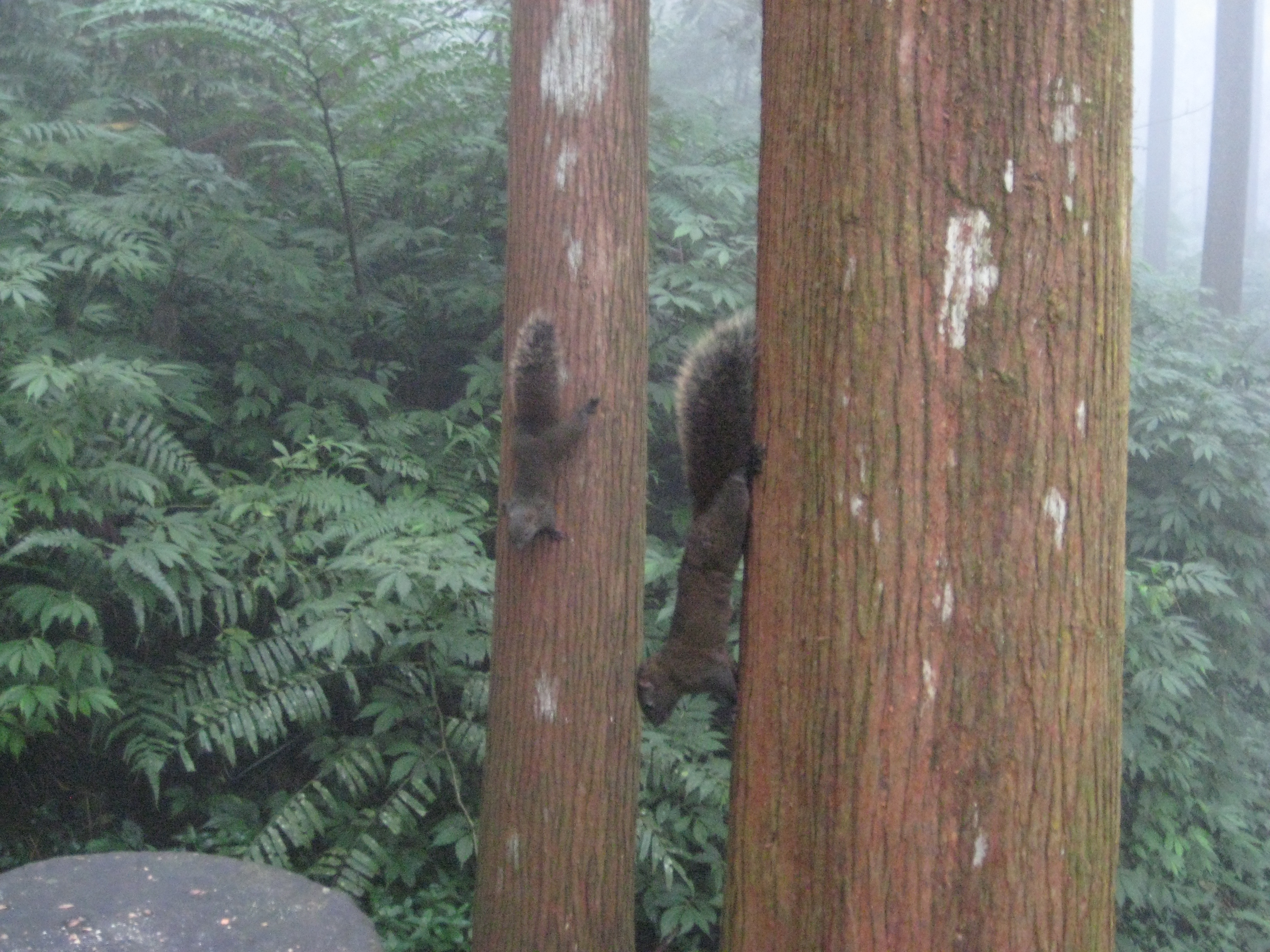 The pluses include the chocolate brown squirrels, the Taiwan University botanical area, the multiple sightings of gray-cheeked fulvetta birds, and the “walk above the trees” (metal walkway built 100 feet above the ground). It is a remarkable experience to be able to walk along this metal walkway in the sky through the fog and mist and peer down to the grounds below. There is a slight wobble felt when walking although you can see it is newer construction so that makes it less daunting.