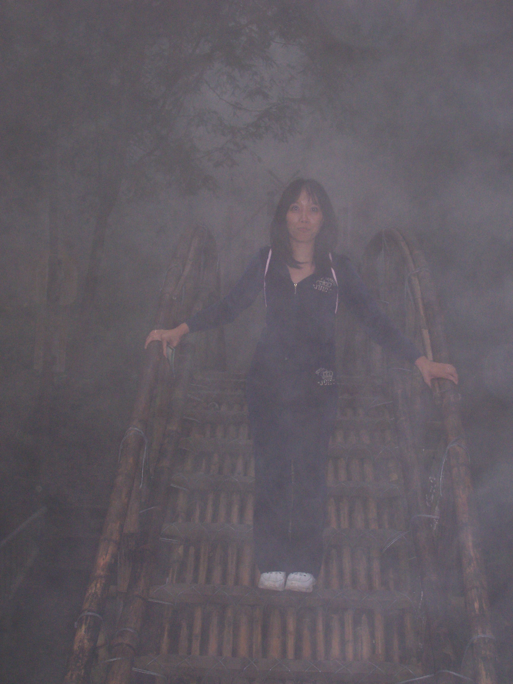 We venture across a traditional bamboo bridge that guides us into this enchanted forest. This takes me back to my days visiting the UC Santa Cruz campus. Of course this is significantly prettier with heavy fog, mist and more diverse plant growth. Around the corner chocolate brown “Pallas” squirrels are scurrying up and down the trees as people drop crumbs of food.