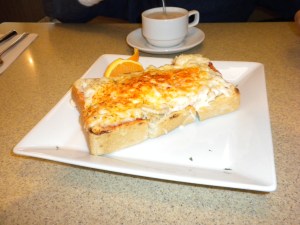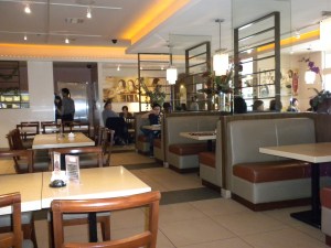 Bella orders a café au lait (charcoal roasted coffee with hot milk) and I order a Colombian coffee. I visit the cake display case and decide on a lemon blueberry cake with a layer of mascarpone cheese inside. Bella orders a tuna melt pizza toast. You press a button at your table to page your server.