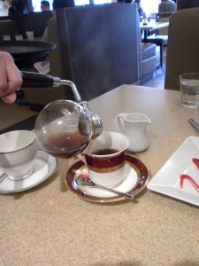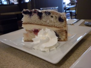 This siphoning method of brewing (see photo of the “chemistry beaker” they bring to your table) results in a superb cup of java. At first glance, my cake looks similar to a coffee crumb cake but the layer of mascarpone cheese adds a creamy texture. Powdered sugar is dusted on the outer edges of the plate. A lemon blueberry explosion occurs in the mouth instantaneously. Combined with the coffee I am in a gastric paradise.
