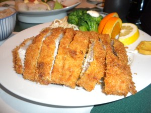 My tonkatsu plate comes with an iceberg lettuce salad with an ironically “icy” texture (I swear it came straight from the freezer). The dressing looks like thousand island and tastes of rice wine vinegar, ginger and lemon. My meal also includes a perfectly cooked bowl of brown rice and miso soup. The soup is light on flavor which is slightly less desirable to this “whitie” whereas I’m guessing most Asians (like my wife) would give it a “double thumbs up”.