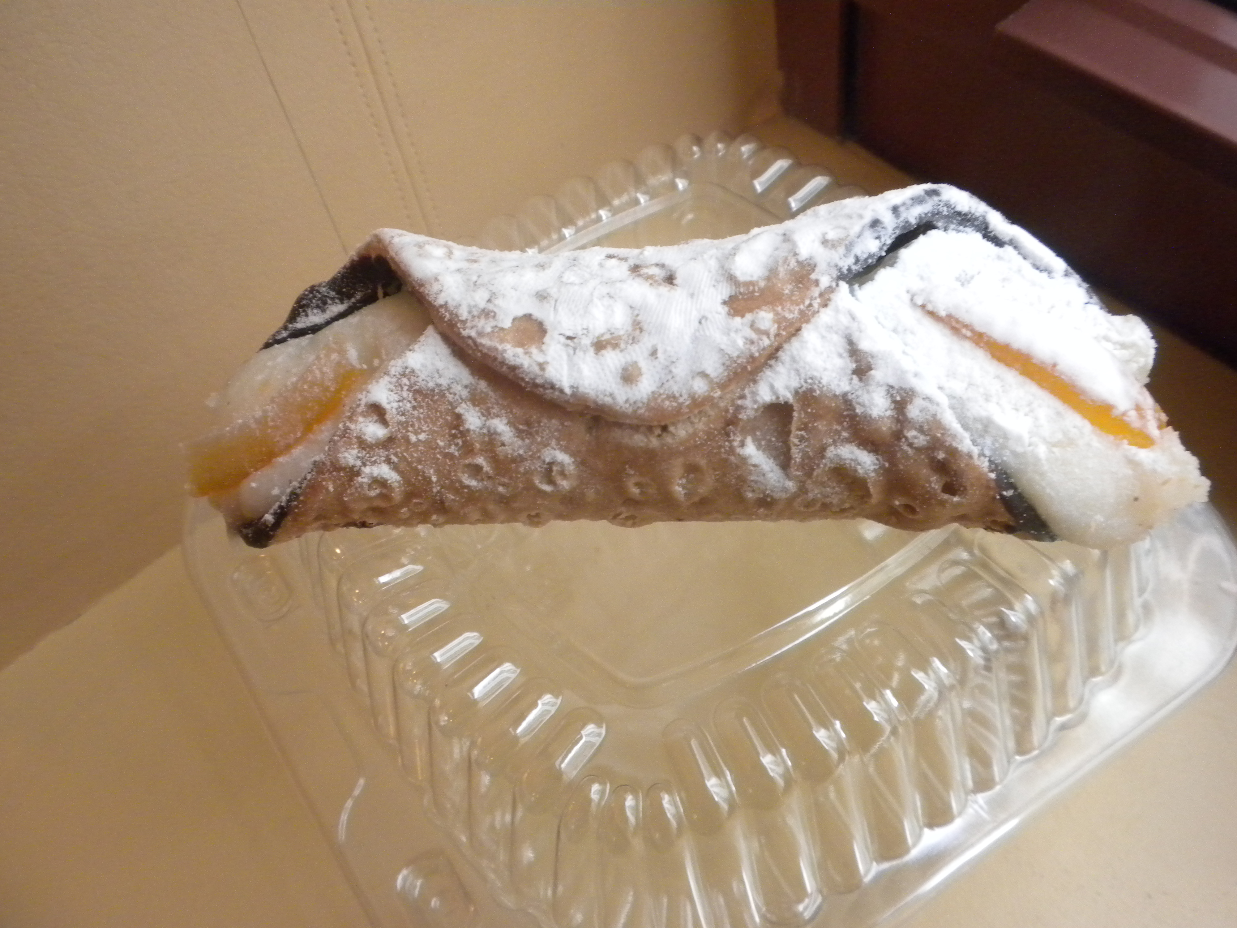 Around the corner we stop in Olin Avenue Market (A: 355 Santana Row, Suite 1030, San Jose, CA 95128. P: 408-753-9136. E: olinavenuemarket@yahoo.com) for a cannolo pastry and a bottled water. The cannoli has a pretty decent “tang” (cream cheese sourness) factor, a fairly firm shell, not crisp but not soggy. The cheese tastes pretty good but the texture is a tad funky looking since they were clearly made some time ago. Also, the powdered sugar was clearly overdone on the shell.