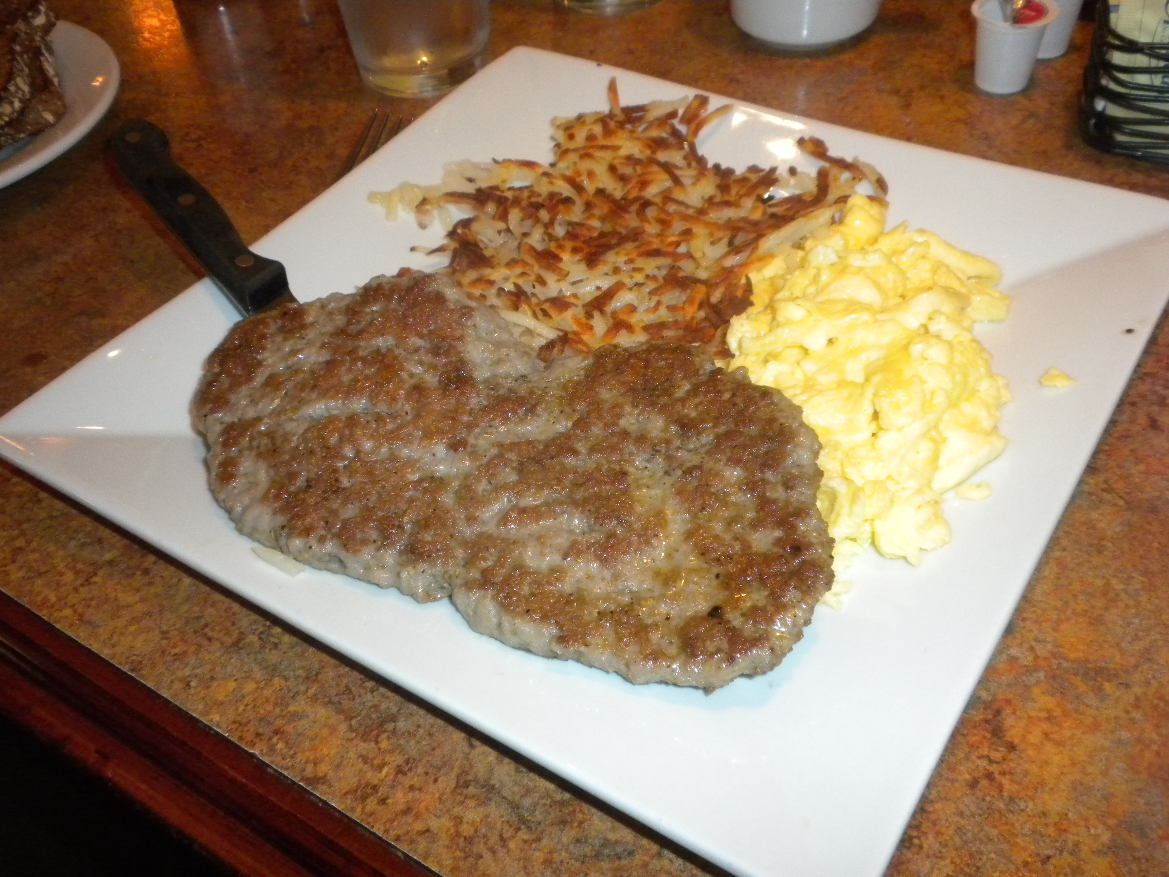 Its morning and I could “eat a horse’s face off”. We park our car near the music competition site and walk to Flames Eatery & Bar (A: 88 South Fourth Street, San Jose, CA 95112. P: 408-971-1960. W: flameseatery.com) for breakfast. Bella and I cannot turn down the Italian sausage and eggs with hash browns and toast. Bella goes with eggs over easy and I select scrambled.