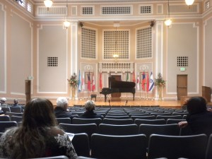 Bella and I enter the theater and take our seats. George enters and begins to play his pieces: Chopin Etude op. 10 No. 8; Beethoven Sonata Op. 90 No. 27, 1st movement; Prokofiev Sonata Op. 14 No. 2, 4th movement. Unfortunately, he is playing the pieces like a trained cross country runner who wants to be a sprinter. Given his inability to achieve the right pacing Bella anticipates that he’ll end up winning nothing.
