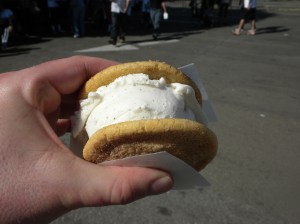 I go for the “one story” snickerdoodle cookie with Tahitian vanilla bean ice cream. The cookies are nice and firm but fresh tasting and the ice cream is creamy and delicious. The wrapper is edible so I bite through the delicious gooey mess.
