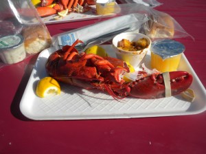 In less than twenty minutes we have our lobster dinners and we’re scouting out a table. We settle on a tall bar table for two and we stand while devouring our lobsters. Bella shows me her paws with two fingers on each paw simulating lobster claws opening and closing. She did this shortly after we met on our first vacation together in Maine.