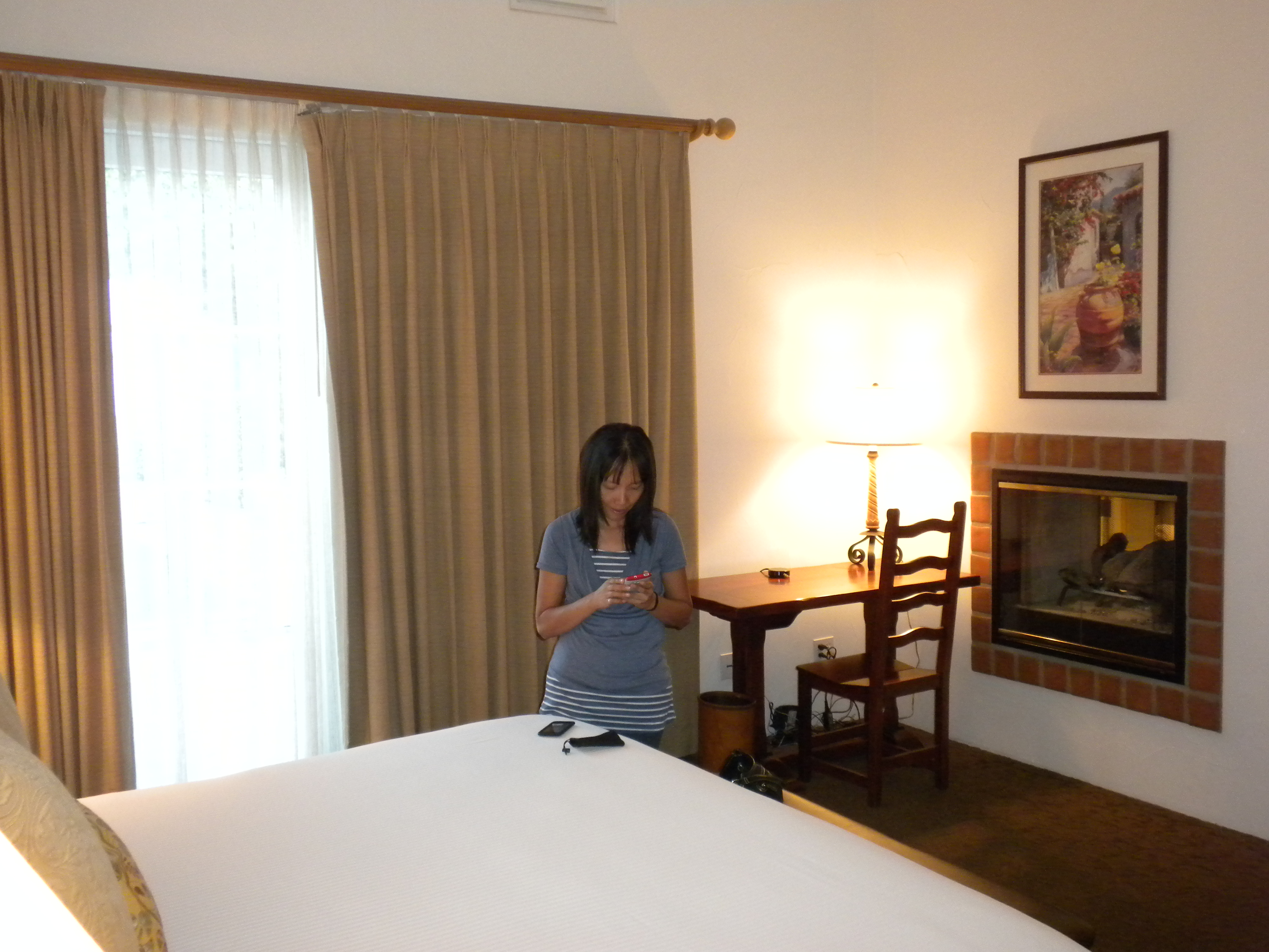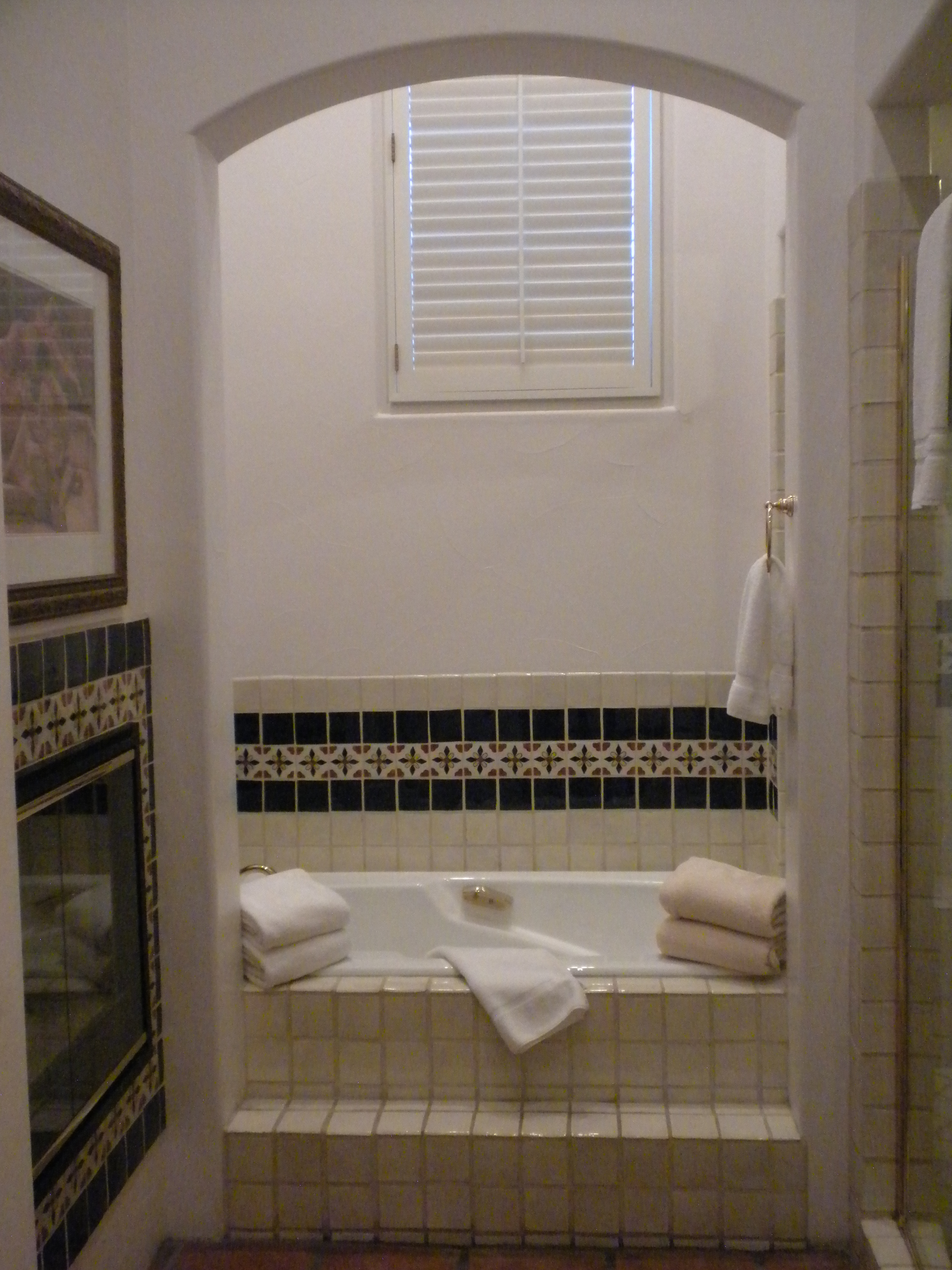 Upon arrival we are fortunate enough that our “standard room” isn’t ready so they upgrade us to a 975 square foot “Spa Villa Suite”(casita).  It features 25 foot ceilings, a peek-a-boo fireplace from bedroom to bathroom, a full kitchen, a living room, a dining table, two patios and a second bathroom.  The promotional deal we bought online includes discount vouchers for spa, breakfast and golf.
