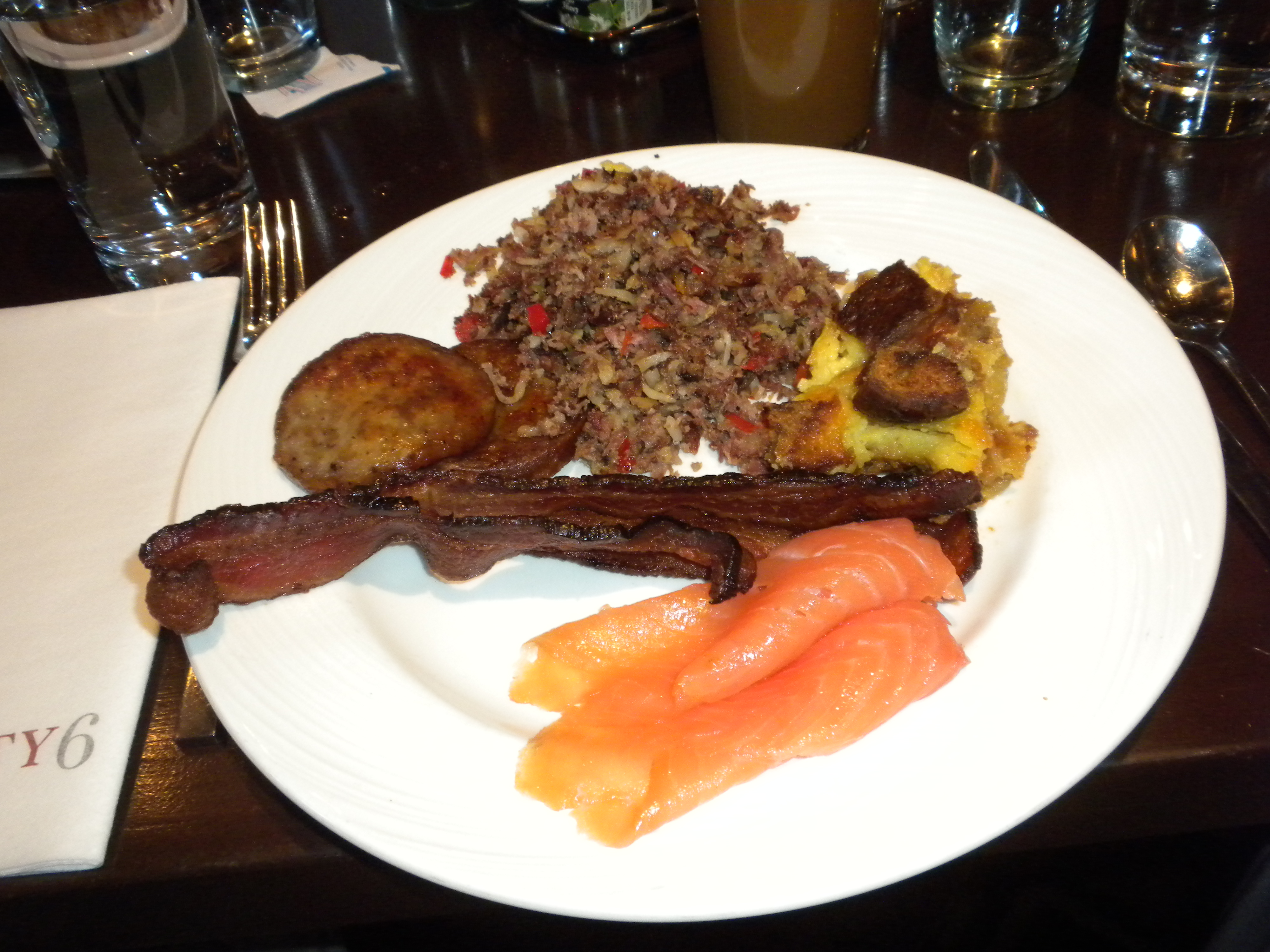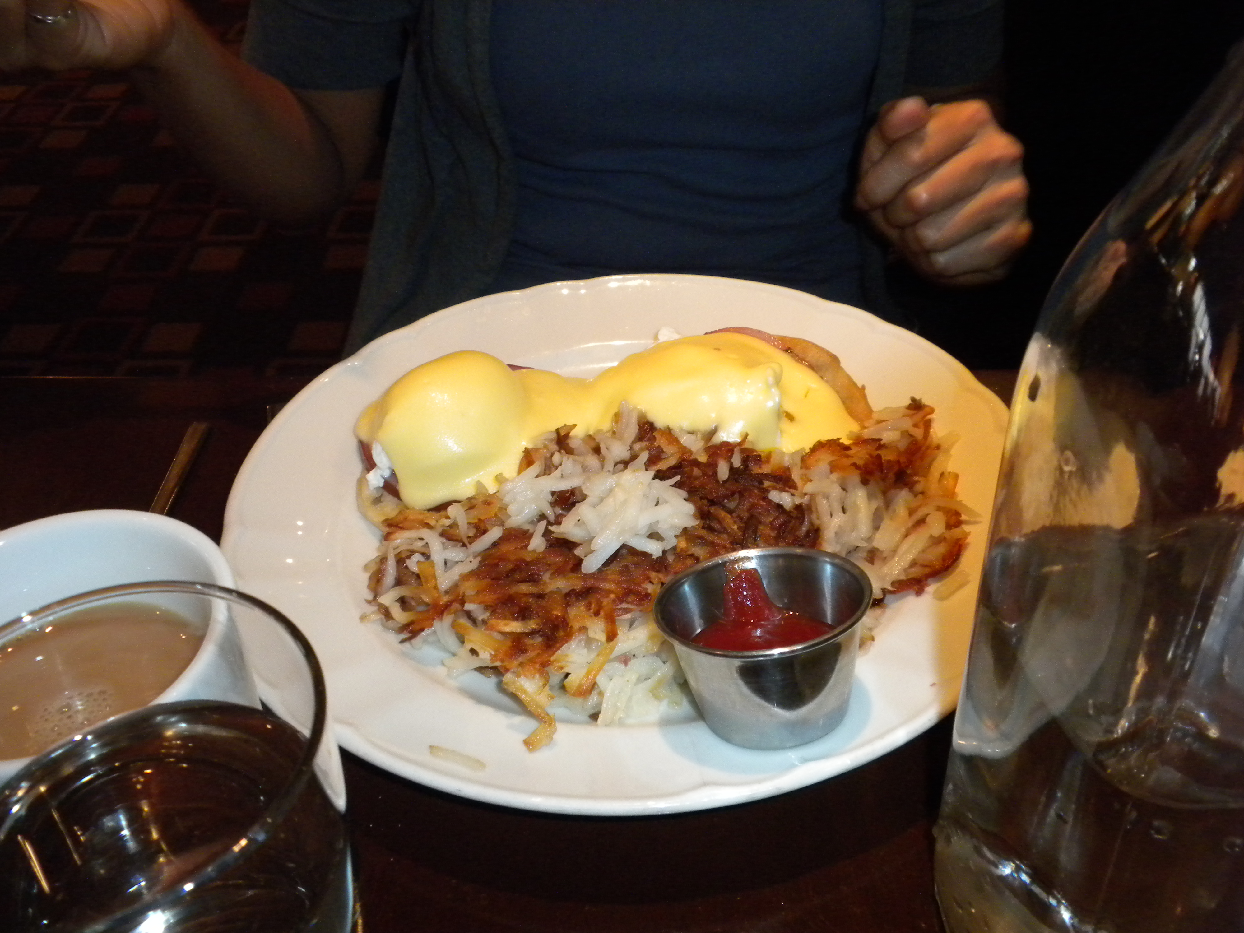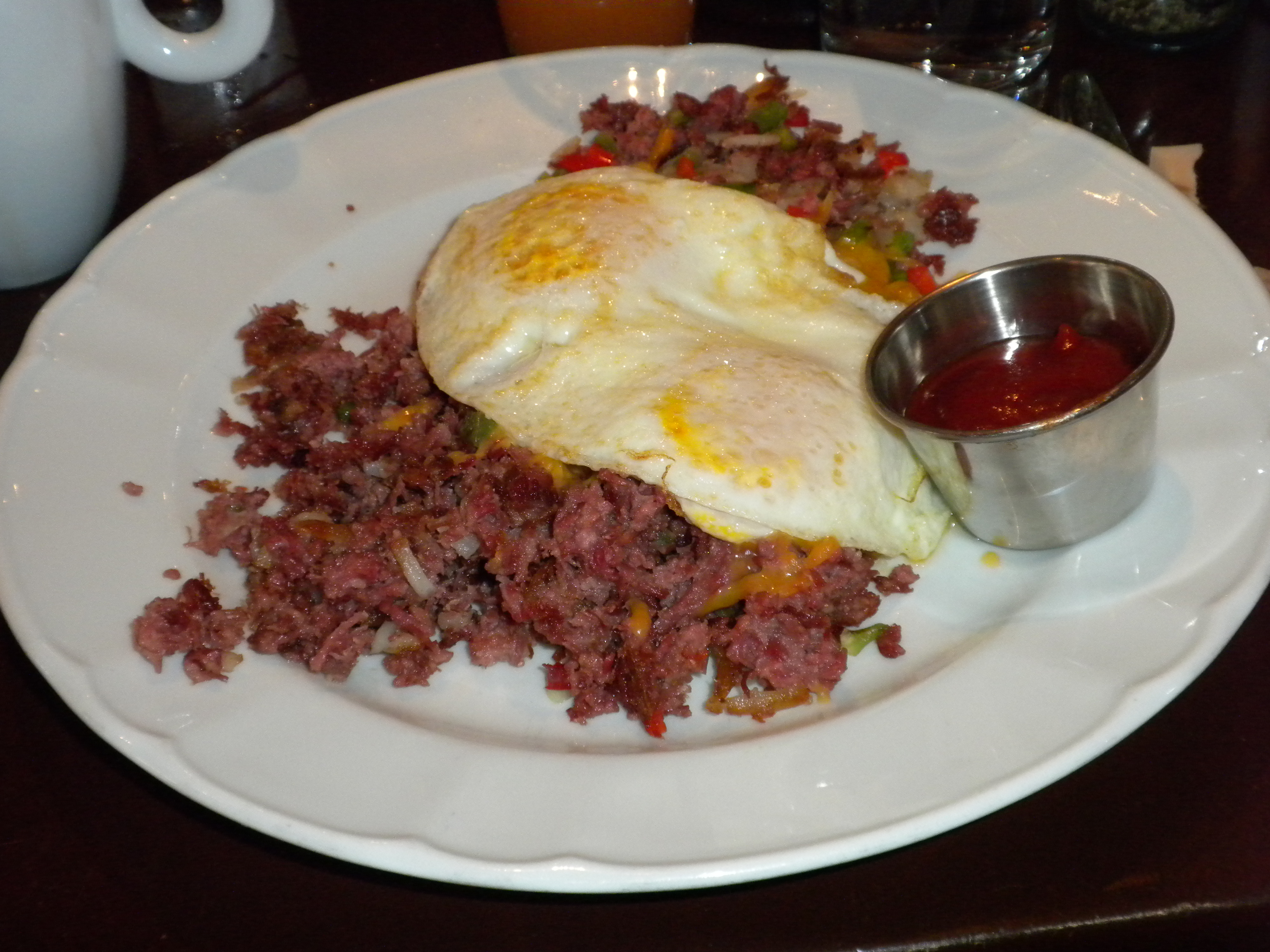 This dish has corned beef hash with peppers, onions, cheese and “eggs over easy” on top.  This is super delicious and serves as a reminder that I need to eat corned beef a little more often.