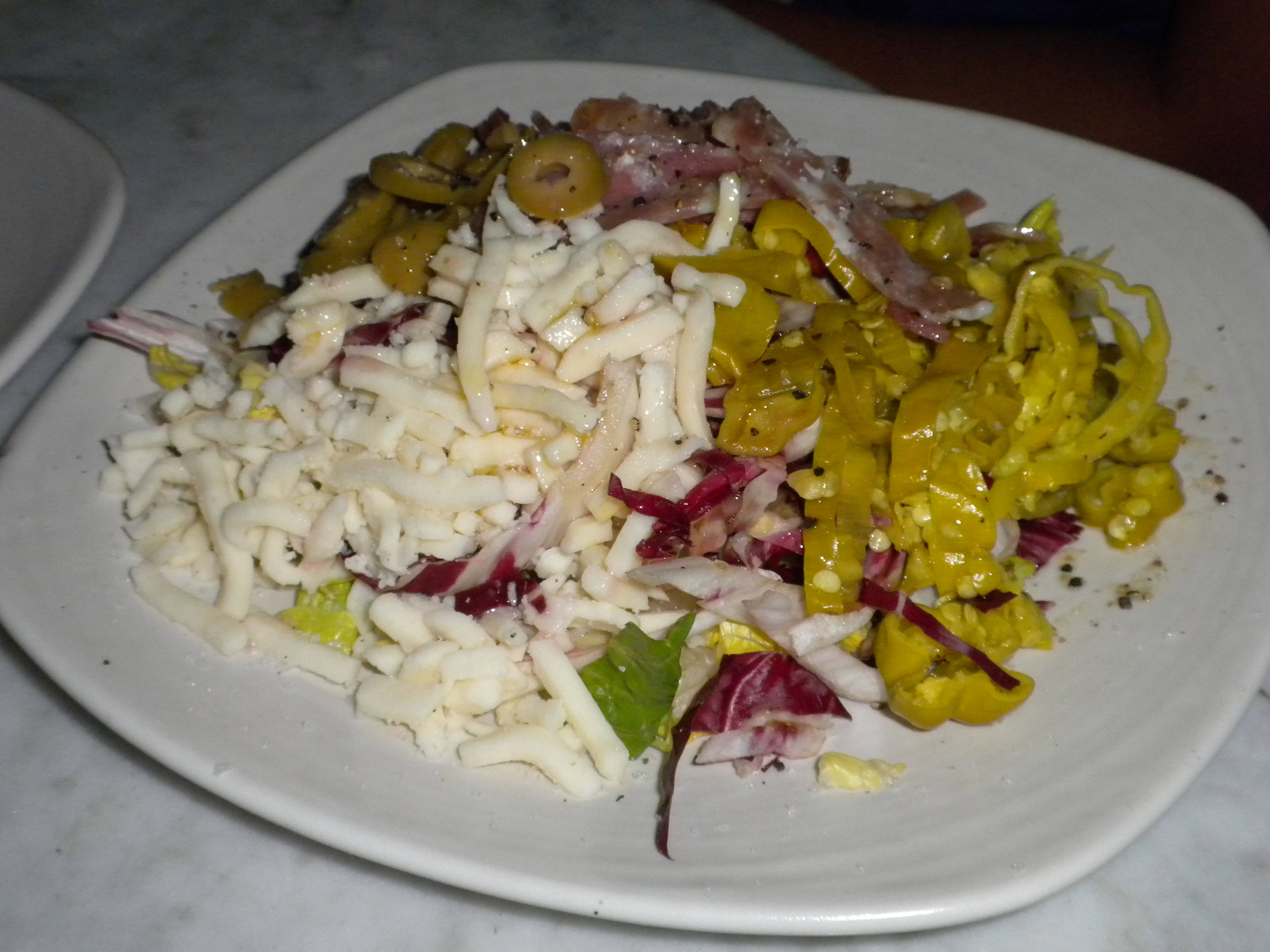 The toppings include arugula, prosciutto, mozzarella, tomato sauce and artichoke.  It is as good as Mario Batali’s Pizzeria Mozza of Newport Beach.  The crust has some char, is crisp but still “poofy”.