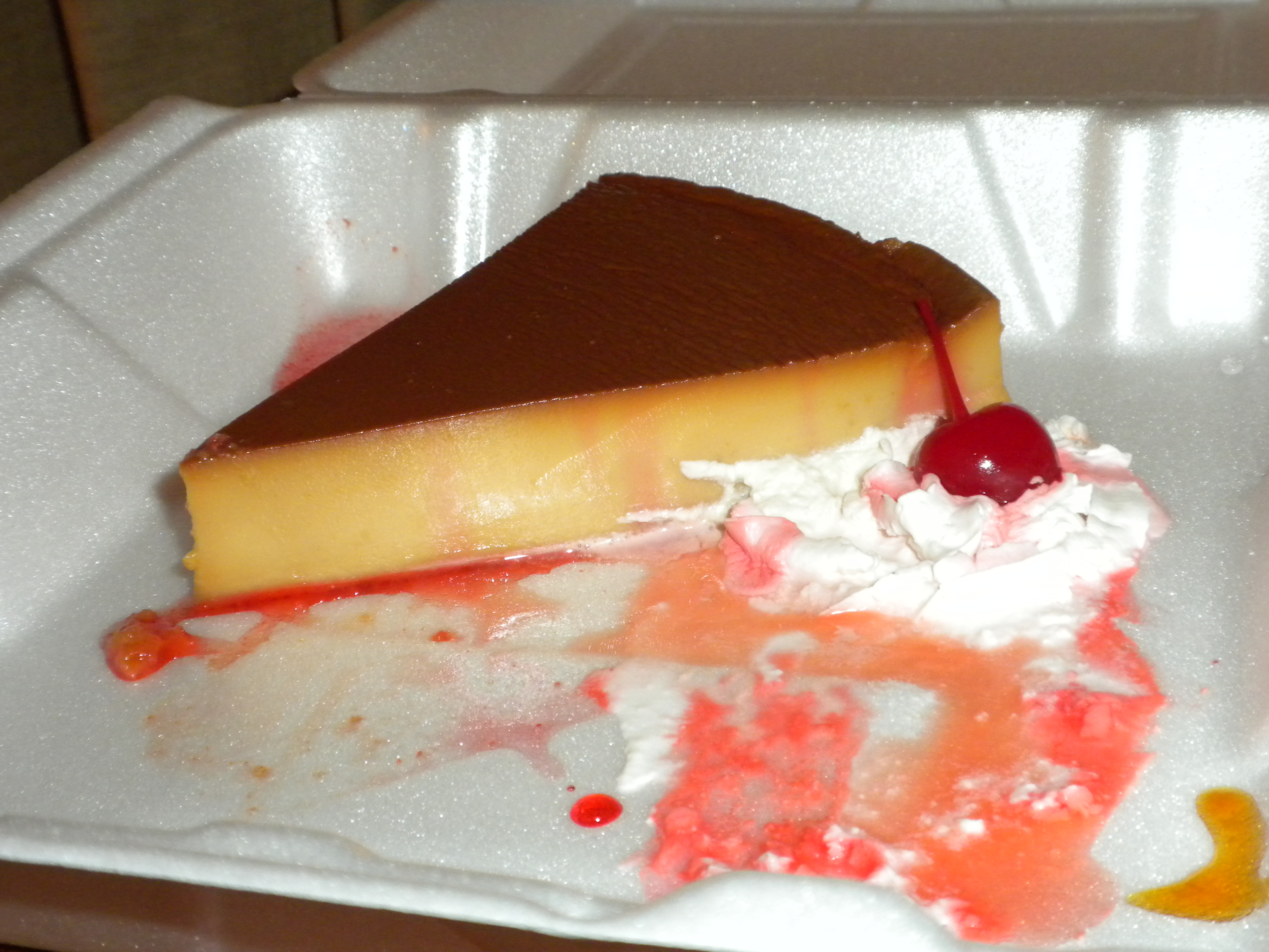 The marinated pork torta sandie with thin and airy bread is beyond good and the marinated steak in our salads is great tasting as well.  The fried ice cream is probably the best I’ve ever had.  I order a piece of flan to-go which is quite good but not on the amazing level.