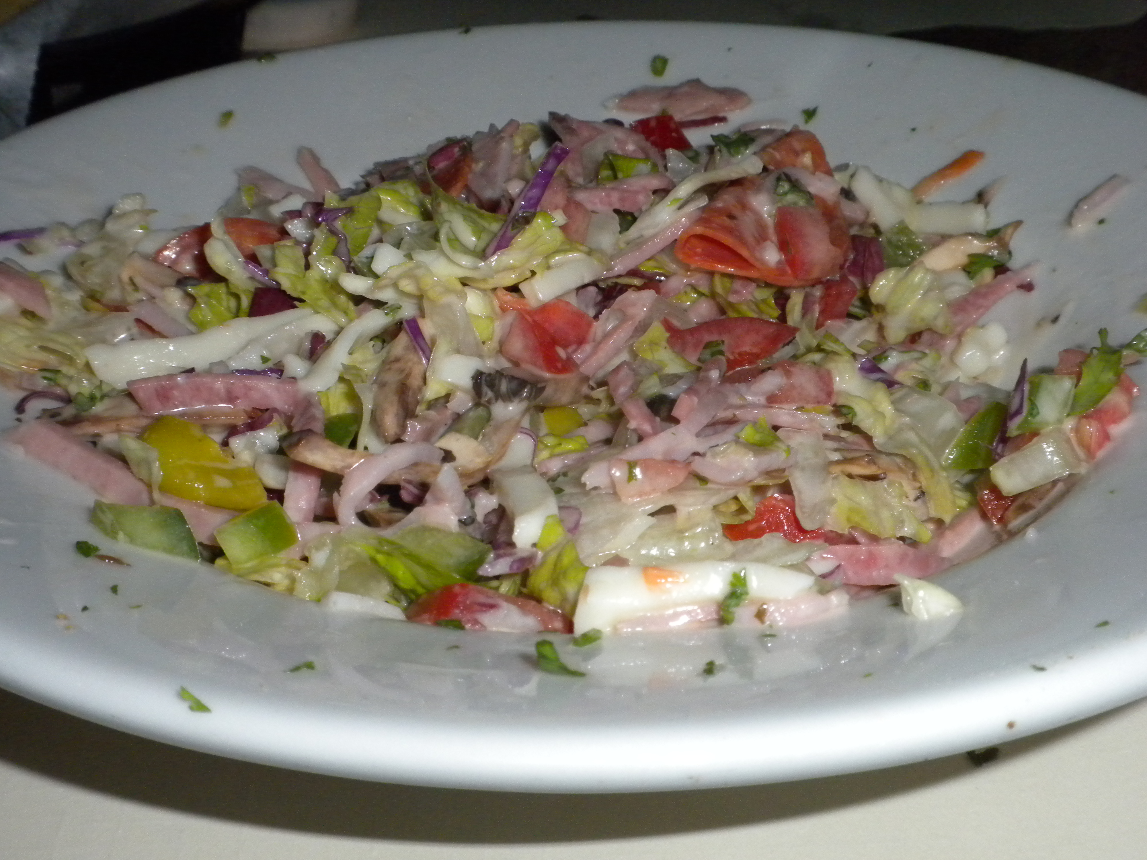 This individual antipasto salad is finely chopped and delicious with a creamy, tangy orangish-pink colored Italian dressing. Their garlic bread is just “okay”.