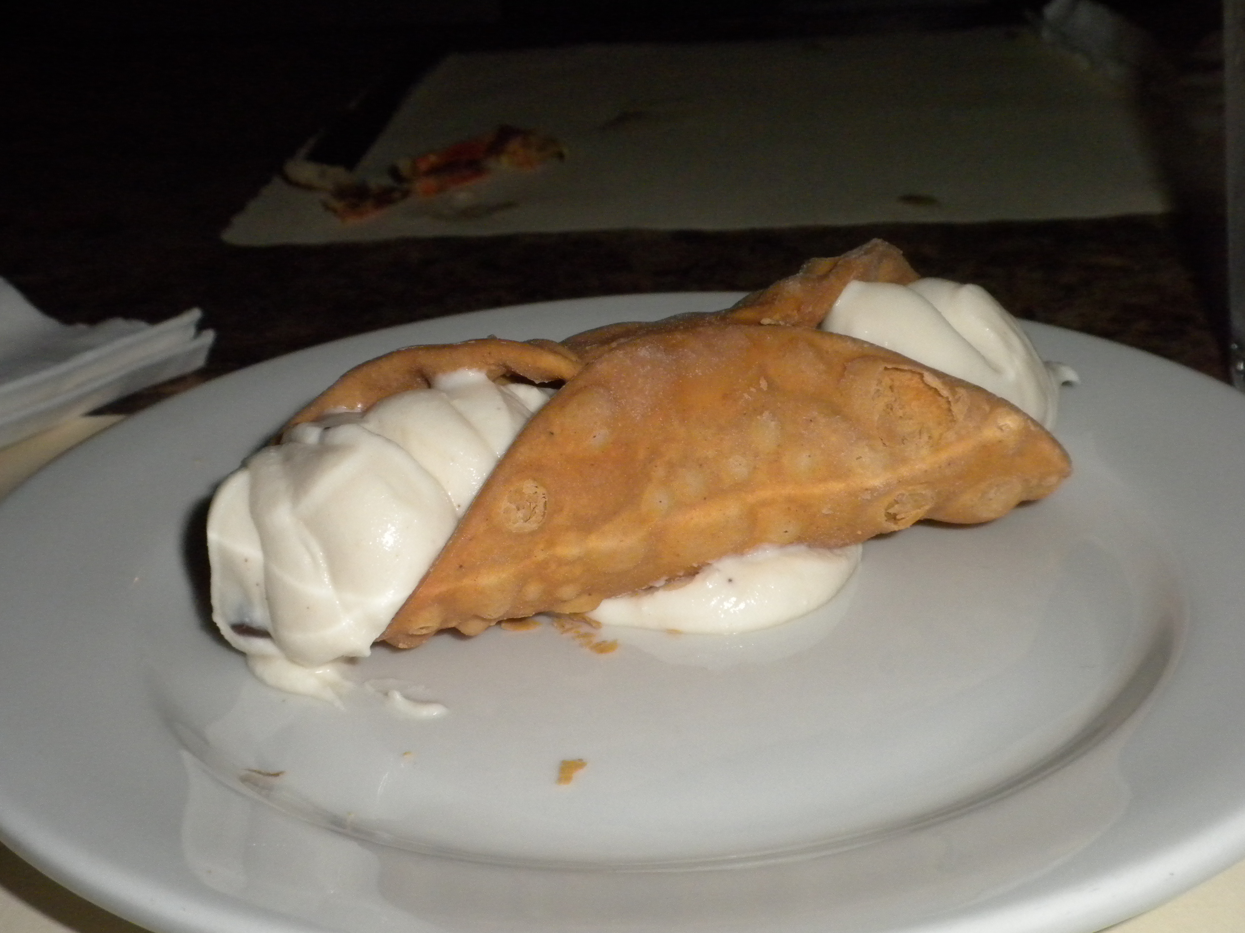 The cannolo is very boring visually but has a firm shell with mostly smooth cream. There is a minor taste of cinnamon with the ricotta cheese. It lacks the hint of sourness I enjoy but is pretty good with moderate sweetness. It could really benefit from the addition of pistachios, candied orange peel, citrus oil, liqueur or at minimum MANY more chocolate chips with vanilla extract or amaretto extract.