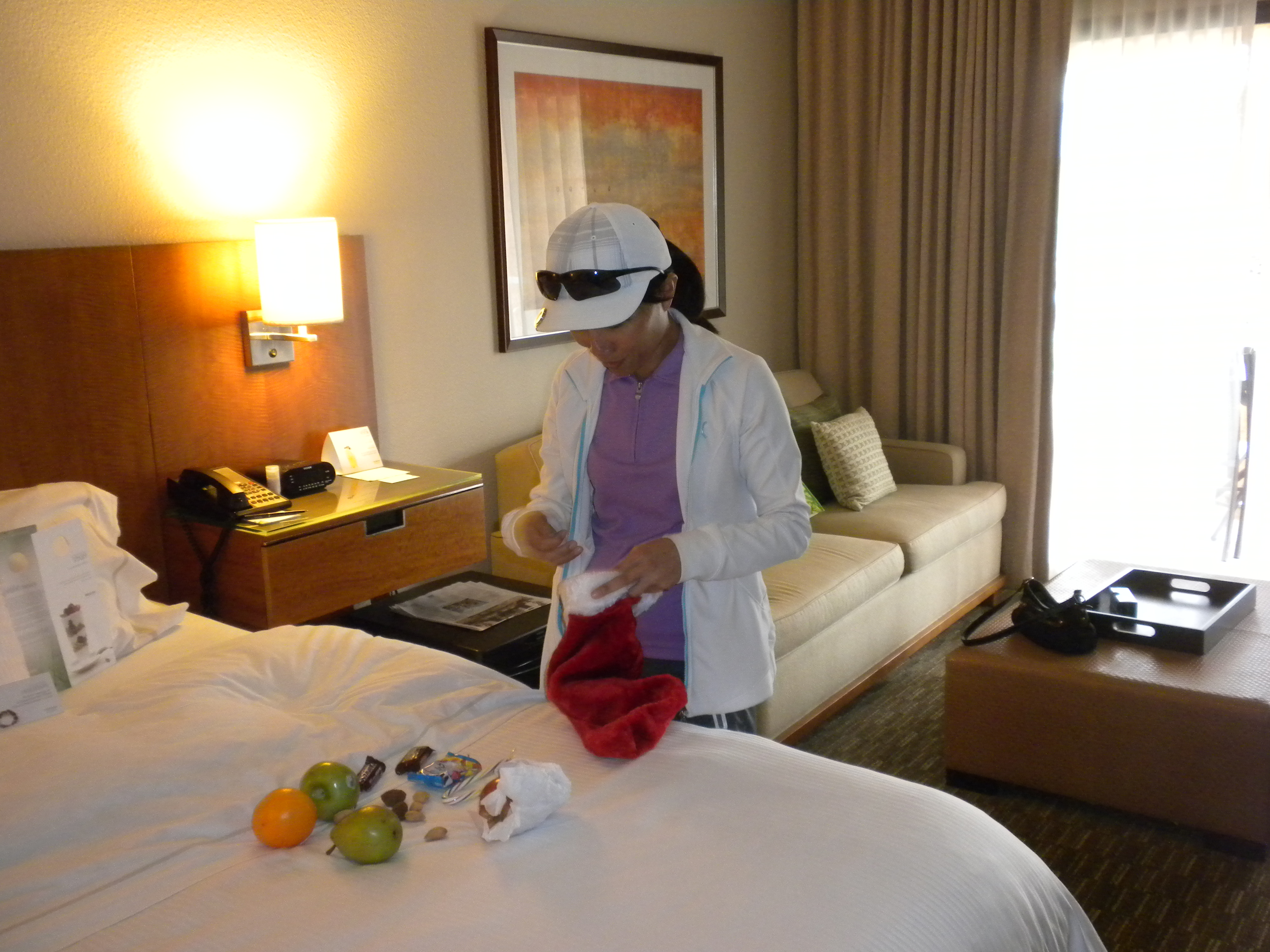 Bella is excited as housekeeping has left this filled stocking for us on Christmas Eve.