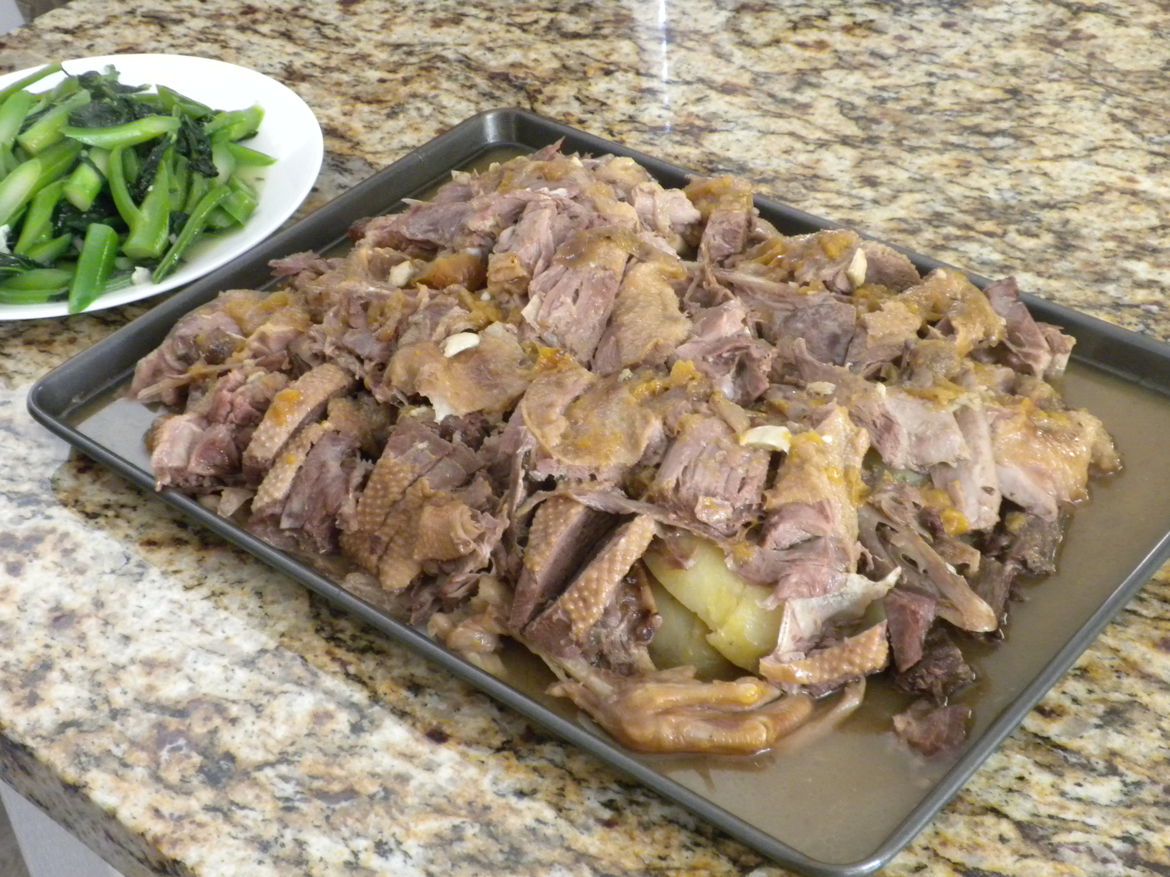 A Chinese meal is being prepared by Shirley’s mom and dad. It includes green onion pancake, goose in plum sauce and green veggies.