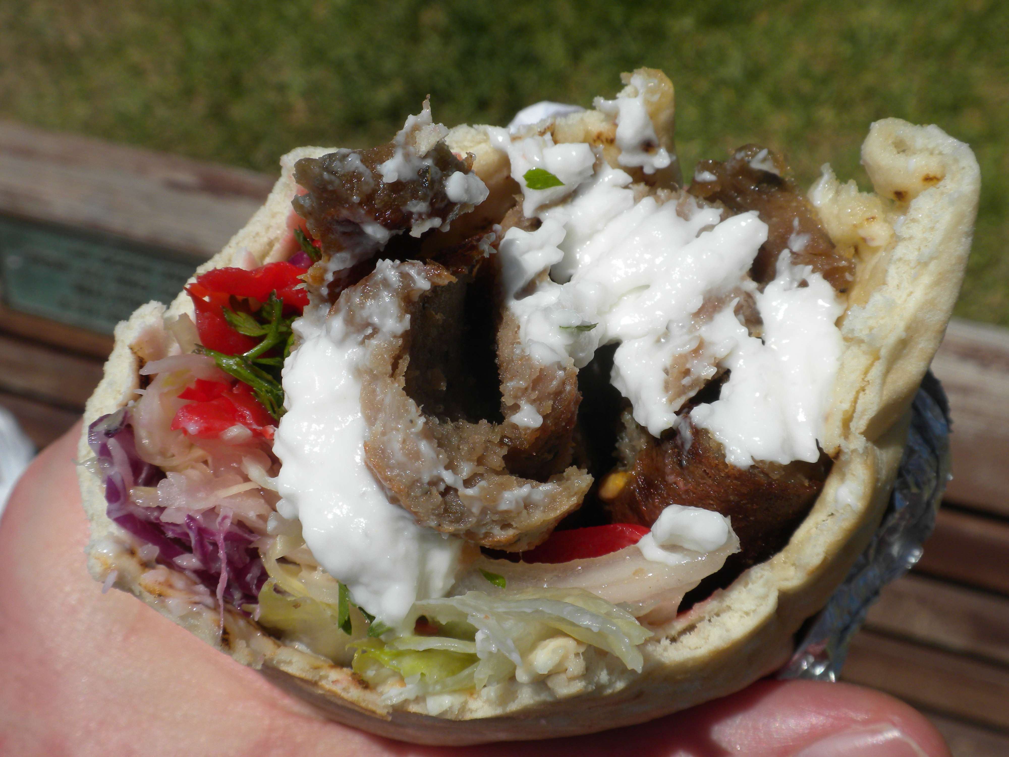 There is an ample amount of beef/lamb on this gyro.  Normally you get tzatziki sauce or garlic lard paste but this has a creamy garlic sauce which is pure perfection.