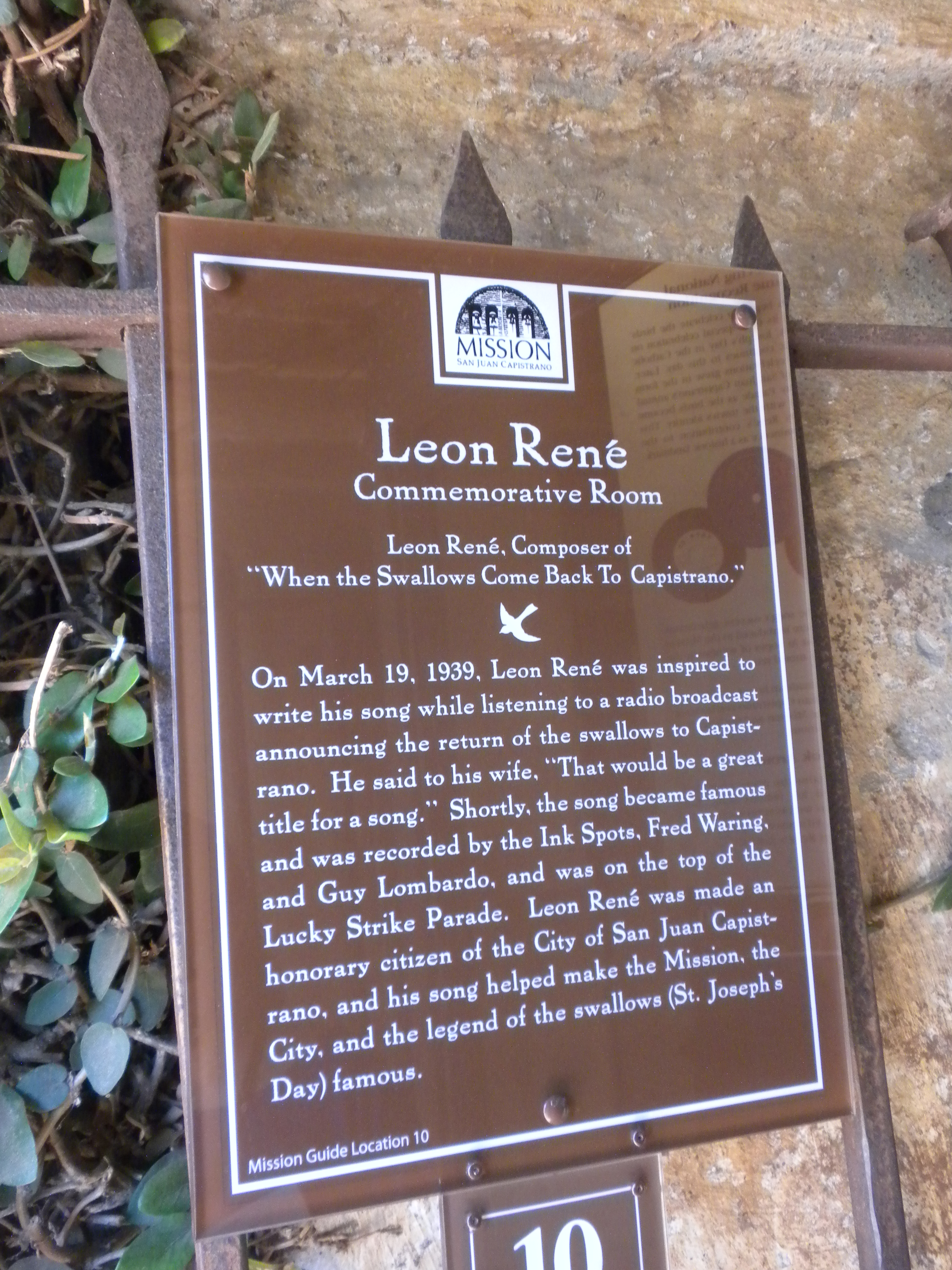 Leon Rene was the composer of the song “When the Swallows Come Back to Capistrano”.  Cliff swallows arrive at the Mission every March 19th.  These birds migrate from Goya, Argentina to San Juan Capistrano.  They can fly up to 600 miles per day.